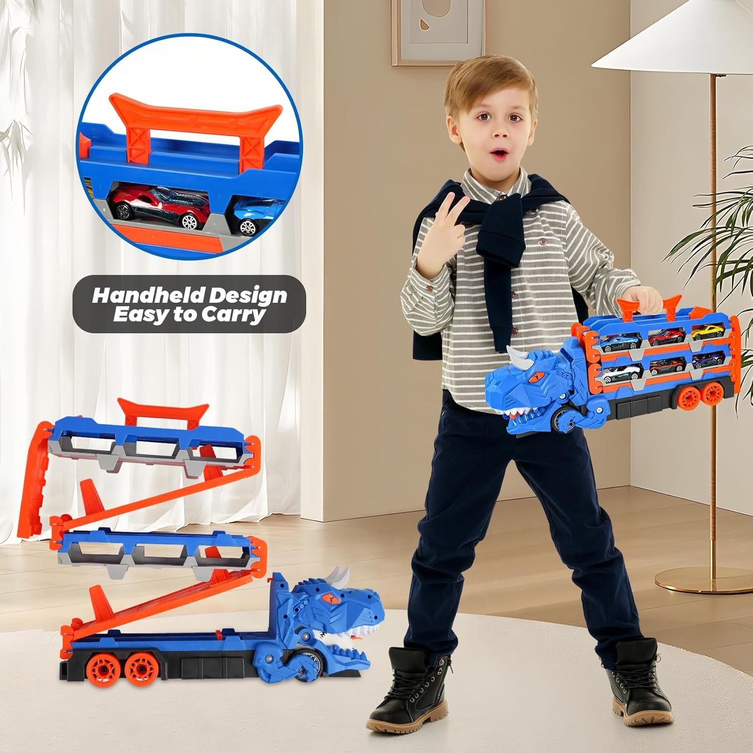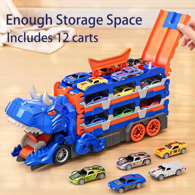 ✨ Innovative Play Experience – Manually push the dinosaur transporter to devour alloy car models, delivering a uniquely entertaining experience for children! Press the button to automatically launch metal cars onto the track via the launcher.